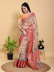 The light, neutral base colour is richly covered with detailed illustrations of artistic flowers, leaves, and traditional motifs, giving it a regal appeal. The saree is adorned with a broad, lustrous Deep Red Zari Woven Border that creates a striking contrast with the print. Its soft fabric and magnificent design make it a perfect choice for festivals, evening functions, and cultural gatherings.