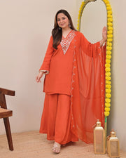 The beautifully embroidered top is paired with matching Fox Georgette Sharara pants and a stunning dupatta, making it a complete premium ethnic ensemble for all occasions.